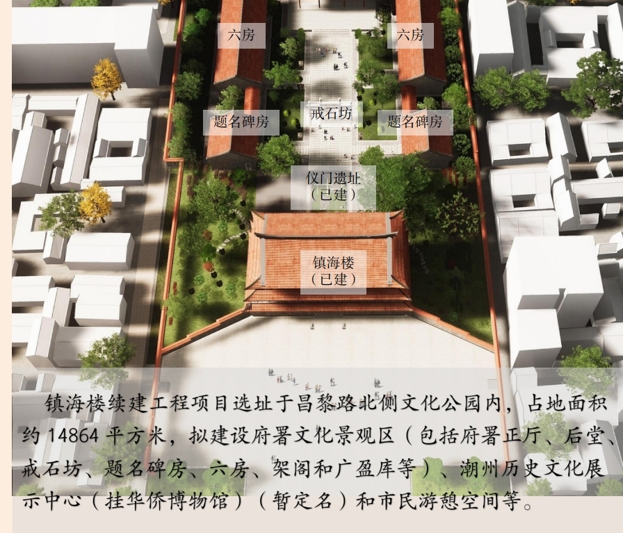 潮州府署谯楼——镇海楼成功复建,赢得了海内外潮人的广泛赞誉,社会各界要求对潮州府署其他历史景观进行续建的呼声非常高。今年来,多位文史专家、潮州市人大代表也积极向市委、市政府提出一些重建历史景观类建筑促进潮州历史文化旅游发展的建议,潮州市委、市政府高度重视,多方走访,倾听民情民意,精心筹划镇海楼续建项目。